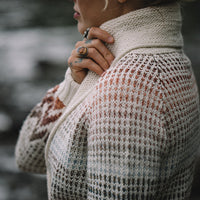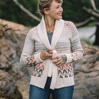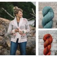 Sister of Andrea Mowry's Spice Cardigan is this beautiful bottom up raglan cardigan. Who doesn't love a good shawl collar cardi!? This bottom up, raglan cardigan gives a classic look a twist with all-over colorwork. Spark is knit in the round and then steeked and finished off with a garter shawl collar and cozy belt to keep out those wintry winds!