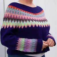 The Easy V sweater is knit top down in the round and features a subtle V shaped neckline which transitions to a round colorwork yoke design. The colorwork is easy to work with short repeats and only 2 colors per row, making the knitting fun and relaxing while letting your color choices stand out as the star of this sweater.