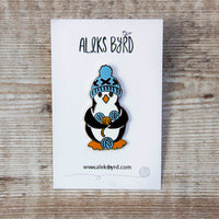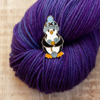 Pengwyn the penguin enamel pin badge, designed by Aleks Byrd, is a cute little project bag companion.