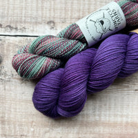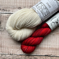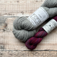 Our kits include combinations of Spincycle Dyed in the Wool with either Walcot Yarns Opus or Life in the Long Grass Merino Sport. The original pattern calls for Spincycle Dyed in the Wool as the main colour (background) and the solid colour as the contrast colour but you can also reverse this combo and have the background as a solid colour and the Dyed in the Wool as the contrast so we've also included all of our kits in reverse combos as well (this is indicated by "Reverse" in the kit name).