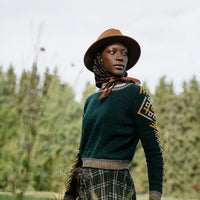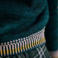 Seli is a seamless cropped top-down raglan featuring embellishment on the cuffs, neckline, hem and sleeves. The cuffs, hem and neckline have corrugated rib and an Estonian knitted braid called a Kihnu Vits. The sleeves have descending motifs created using the inlay technique called Roosimine. The sweater is worked seamlessly by placing sts for the sleeves on hold using waste yarn or a holder while completing the body.