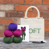 - 125g of super soft British wool in DK Green, DK Amethyst, and DK Magenta