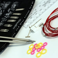 - Accessories: 2 x mini cable connectors, 2 x mini end stoppers, stitch markers, needle gauge, rubber gripper