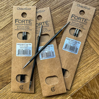 ChiaoGoo Forté 13cm/5in stainless steel and carbon fibre tips are beautiful as well as strong and durable. With the same perfectly tapered tip we love in the Twist needles these have a warm carbon fibre shaft on the small sizes and a blackwood shaft in the larger sizes. Securely assembled with press-fit technology and the joins are precision ground for smooth connections and accuracy. Advanced nano-coating technology ensures a slick yarn feed.