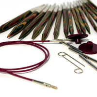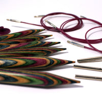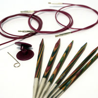 Chunky set: If you love knitting with thicker yarns, this is the set for you! Included are three needle tips (9.00, 10.00 and 12.0 mm), three cables (60, 80 and 100cm), six cable end-caps, three cable keys and a cable connector.