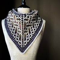 Dark Matter Cowl begins similar to a top-down triangular shawl with an I-cord tab cast-on. After working several rows flat, the ends are joined, and patterning continues in the round to create a bandana style cowl. This method of construction requires no seaming.