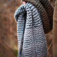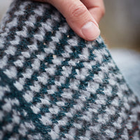 Sample shown in Nocturne from Spincycle Yarns (100% Merino Wool, non-superwash; 200 yd / 183 m per 50 g skein), and in Fluff from Walcot Yarns × Les Garçons (55% Baby Alpaca, 18% Fine Merino Wool, 17% Mulberry Silk, 10% Yak; 219 yd / 200 m per 50 g skein).