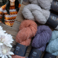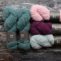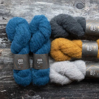 The kit includes the following colourways in the required quantities on our Fluff base. The pattern is not included; it can be purchased on Ravelry.