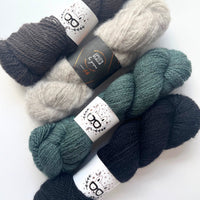 Sample shown in British DK from Les Garçons (70% Bluefaced Leicester Wool, 30% Masham Wool, non-superwash; 263 yd / 240 m per 100 g skein), in the “Édith’s Butler” (Yarn A), “Jonathan’s Soft Day” (Yarn C) and “Natural” (Yarn D) colourways, and in Fluff from Walcot Yarns × Les Garçons (55% Baby Alpaca, 18% Fine Merino Wool, 17% Mulberry Silk, 10% Yak; 219 yd / 200 m per 50 g skein), in the “Officer” (Yarn B) colourway.