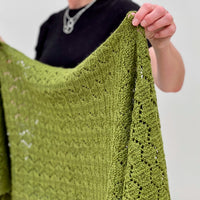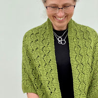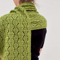 The shawl combines an eyelet cross with garter stitch to create a series of linked diamond shapes within a textured grid. The stitch pattern is reversible, with subtle differences visible between stocking stitch sections on the right side of the knitting and the corresponding reverse stocking stitch areas on the wrong side.