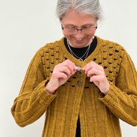 Rib is also used for the front bands, with the upper slots forming three buttonholes. The lower part of the fronts and back are worked in a wide rib pattern that extends into the upper slot pattern. The set-in sleeves are also knitted in wide rib with slot-patterned cuffs.