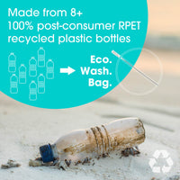 Made from reycled plastic bottles • Each Eco Wash Bag diverts 8+ plastic bottles from oceans and landfills • First production run diverted over 100,000 plastic bottles from oceans and landfills. •Helps clothing last longer by reducing wear and tear • All packaging is 100% recycled, and recyclable.